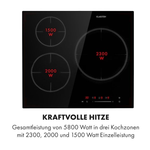 Bếp từ Klarstein Delicatessa có 3 bề mặt nấu ăn cho thực phẩm với tổng công suất lên đến 5800W, được phân bổ trên các bề mặt nấu riêng biệt với 2300W, 2000W và 1500W và đun sôi các chất trong nồi và chảo ở thời điểm cao điểm.