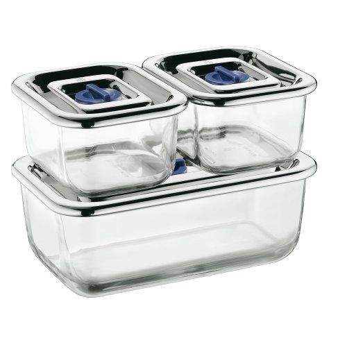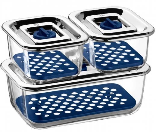 Bộ hộp thủy tinh đựng thực phẩm WMF 3 món giúp giữ thực phẩm tươi ngon với chất liệu hộp đựng bằng thủy tinh, nắp bằng thép không gỉ Cromargan 18/10, gioăng và van bằng silicone, cực đẹp và tiện dụng.