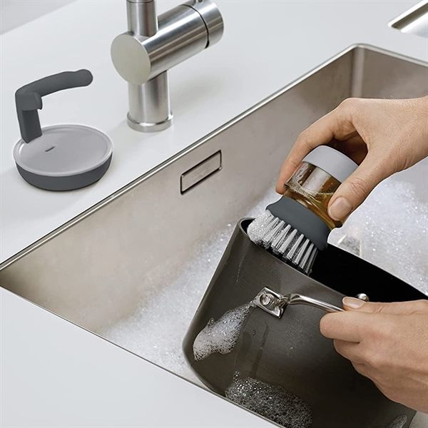 Hợp lý hóa bồn rửa của bạn với thiết kế gọn gàng, nhỏ gọn của bàn chải cọ rửa thông minh Joseph. Bàn chải rửa bằng lòng bàn tay chắc chắn này có một ngăn chứa chất lỏng rửa dễ đổ đầy giúp phân phối lượng xà phòng cần thiết chỉ bằng một lần nhấn nút trên cùng.
