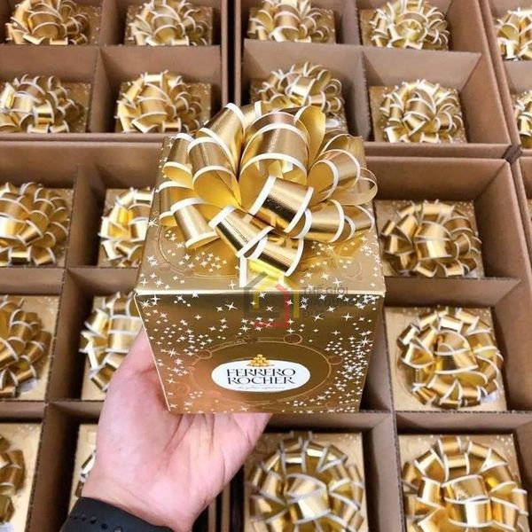 Hộp socola được trang trí nơ vàng ánh kim – thể hiện sự tinh tế và lịch sự khi tặng quà. Đây là một trong những mẫu hộp đẹp nhất của Ferrero.