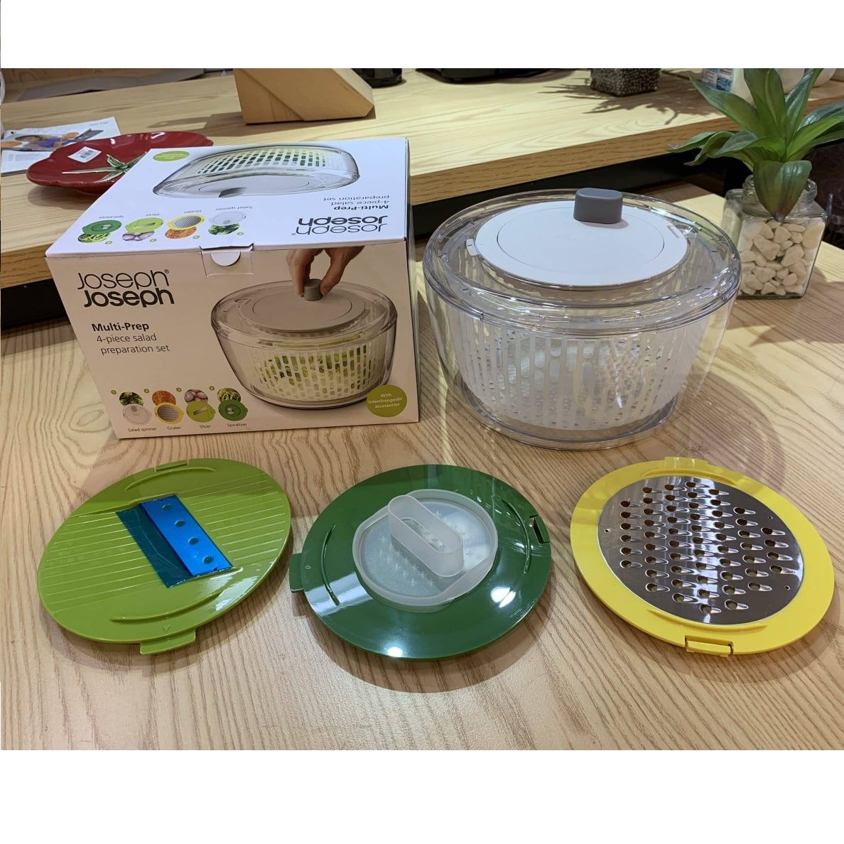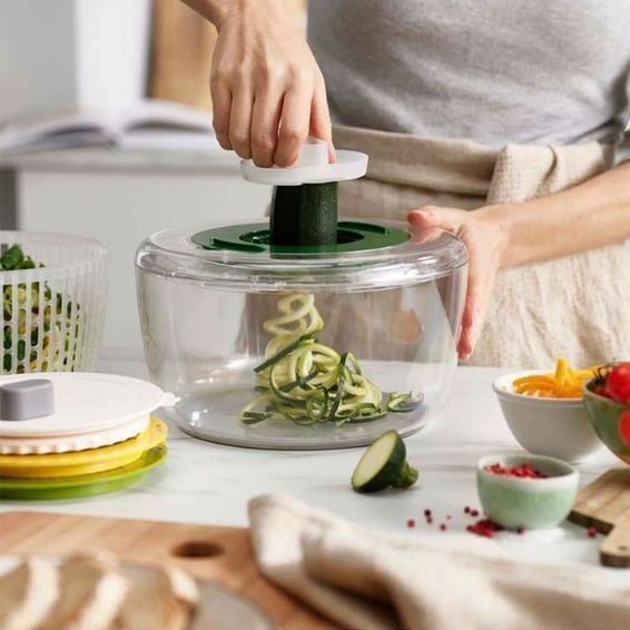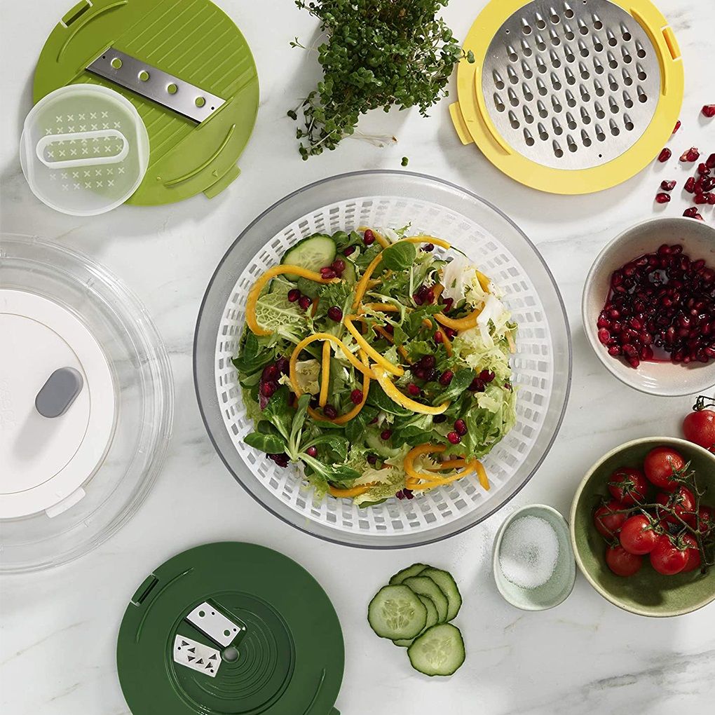 - Rổ quay rau thông minh Joseph thiết kế vô cùng thông minh và tiện ích với bốn đĩa có thể hoán đổi cho nhau cho các nhiệm vụ khác nhau: quay salad, cắt xoắn ốc, bào và cắt lát.