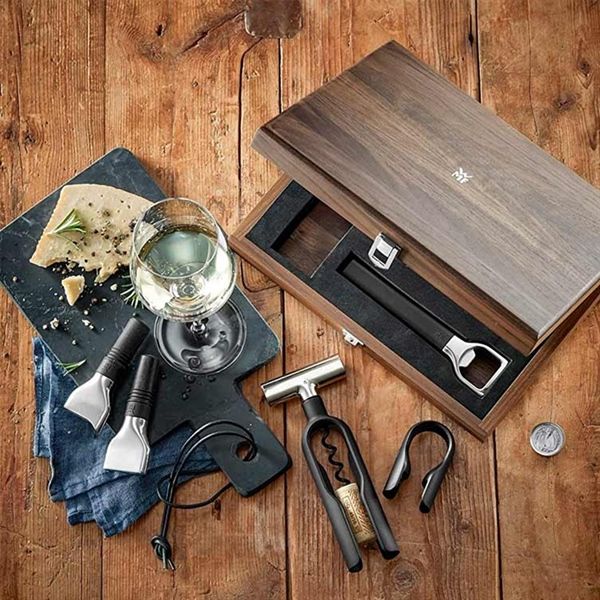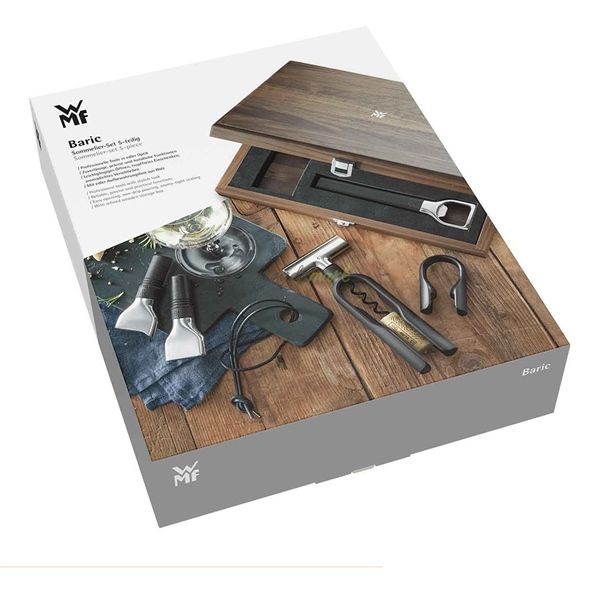 Những người pha rượu chuyên nghiệp và những người sành rượu bình thường đều biết cách tận hưởng những gì tốt đẹp nhất trong cuộc sống. Và để thưởng thức ngay cả loại rượu bình thường nhất cũng phải tuân theo một nghi lễ nhất định, theo đó WMF đã tạo ra bộ 5 món Baric. Bộ dụng cụ mở rượu vang WMF hoàn chỉnh với các phụ kiện chuyên nghiệp dành cho những người yêu thích rượu vang và trong một hộp gỗ óc chó có khóa, trang nhã và sang trọng.