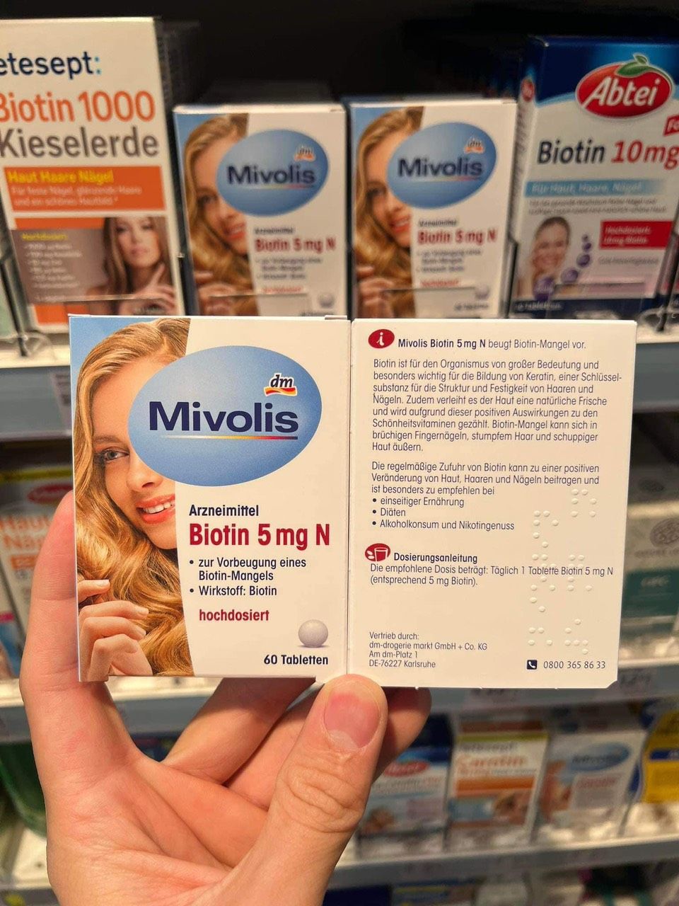 Biotin có tầm quan trọng rất lớn đối với cơ thể và đặc biệt quan trọng đối với sự hình thành keratin, một chất quan trọng đối với cấu trúc và độ chắc khỏe của tóc và móng. Nó cũng mang lại cho làn da vẻ tươi trẻ tự nhiên và được xếp vào danh sách các loại vitamin làm đẹp do những tác động tích cực này. Sự thiếu hụt biotin có thể biểu hiện bằng móng tay giòn, tóc xỉn màu và da bong tróc. Việc bổ sung biotin thường xuyên có thể góp phần vào sự thay đổi tích cực của da, tóc và móng tay và đặc biệt được khuyến khích cho chế độ ăn kiêng một chiều, ăn kiêng, uống rượu và tiêu thụ nicotine. Viên uống Mivolis Biotin 5mg N giúp bổ sung biotin hàm lượng cao, chăm sóc da, tóc và móng khỏe mạnh, ngăn ngừa rụng tóc. Mang lại làn da tươi trẻ tự nhiên, giảm sạm nám, mái tóc dày chắc khỏe, móng tay móng chân hồng hào sáng bóng. Sản phẩm hoàn toàn thuần chay.